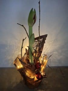 Amaryllis Rot im Kokosfasermantel – mit Lichterkette