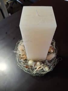 Elegante cremefarbene Blockkerze mit Lichterkette im handgefertigten Natur-Arrangement aus Draht, Zapfen und Federn – stimmungsvoll beleuchtet für eine gemütliche Winterdekoration.