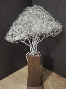 Handgefertigte Drahtbaum-Skulptur auf massivem Holzsockel – ein ausdrucksstarkes Unikat, das Kunst, Natur und Design in einer zeitlosen Form vereint.