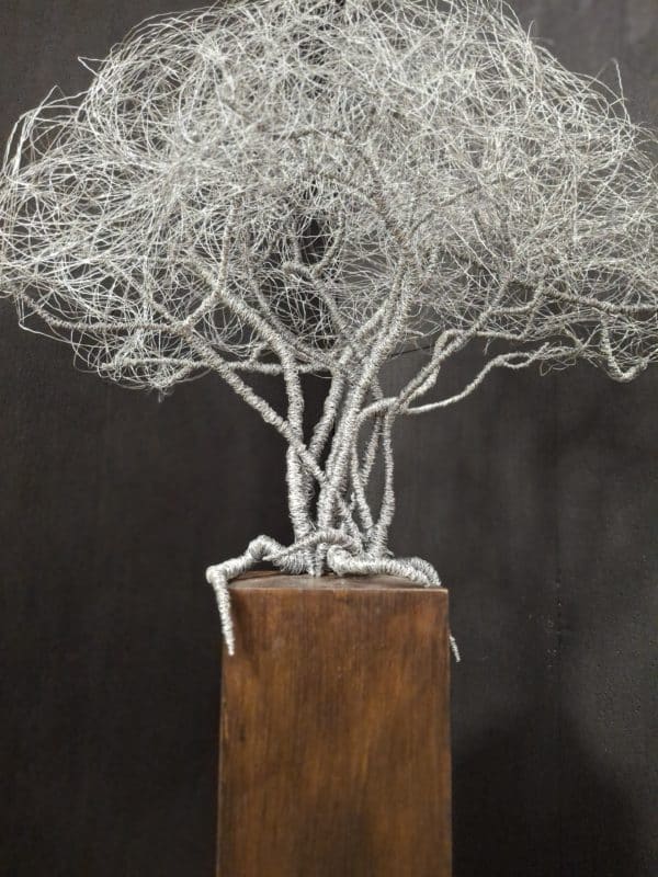 Handgefertigte Drahtbaum-Skulptur auf massivem Holzsockel – ein ausdrucksstarkes Unikat, das Kunst, Natur und Design in einer zeitlosen Form vereint.