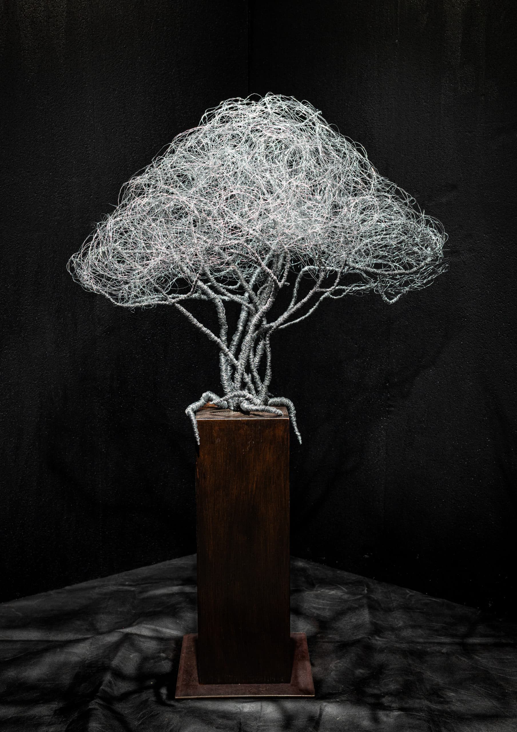 Der massive Holzsockel bildet den warmen Gegenpol zur silbernen Drahtstruktur. Er sorgt für Stabilität und verleiht der Skulptur eine ruhige, geerdete Basis. So entsteht ein ausgewogenes Zusammenspiel aus Stärke und Leichtigkeit.