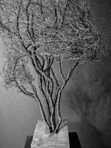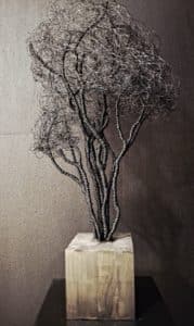 Die filigran gearbeitete Baumkrone aus schwarzem Wickeldraht wirkt wie ein schwebendes Geflecht aus Linien und Licht. Je nach Blickwinkel verändert sich ihre Erscheinung – mal kraftvoll, mal beinahe schwerelos. Der massive Holzsockel bildet dazu einen ruhigen, erdenden Kontrast und verleiht dem Objekt Standfestigkeit und Präsenz.