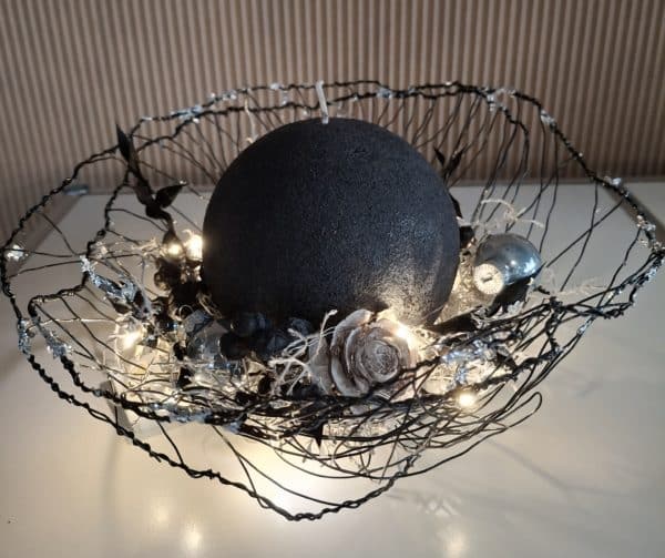 Moderner schwarzer Drahtkorb mit dekorativer Kugelkerze, Naturmaterialien und warmweisser Lichterkette. Ideal für einen eleganten Advents- oder Winterlook.
