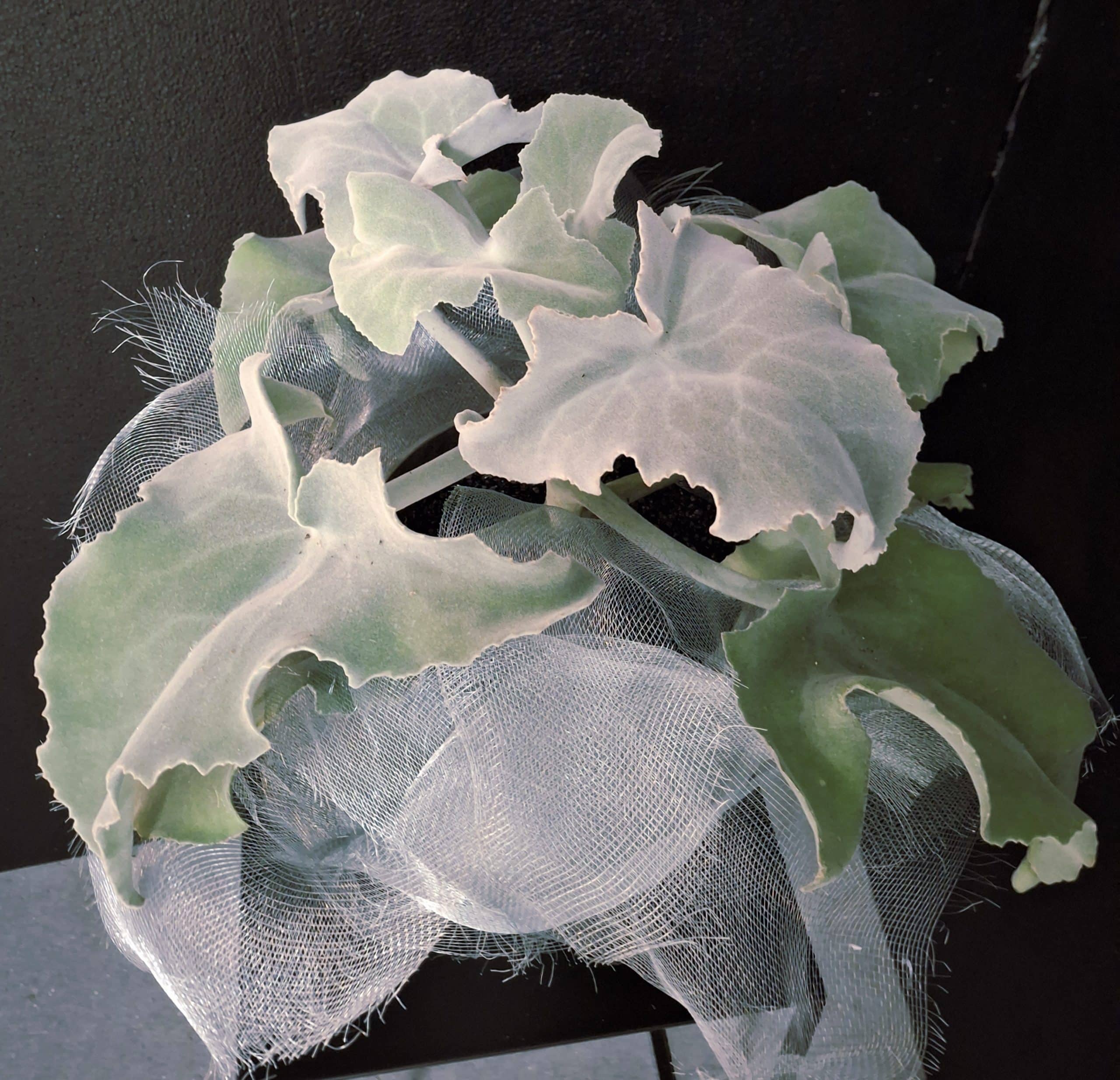 Die samtig wirkenden, leicht gewellten Blätter der Kalanchoe setzen einen spannenden Kontrast zur kühlen, grafischen Drahtstruktur. Das Zusammenspiel aus weicher Pflanzenform und filigranem Metall verleiht der Komposition eine ruhige, zugleich sehr edle Präsenz. Ob auf einem Sideboard, im Regal oder als bewusst platzierter Akzent im Raum – dieses Stielecht-Unikat wirkt reduziert, exklusiv und zeitlos.