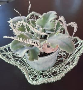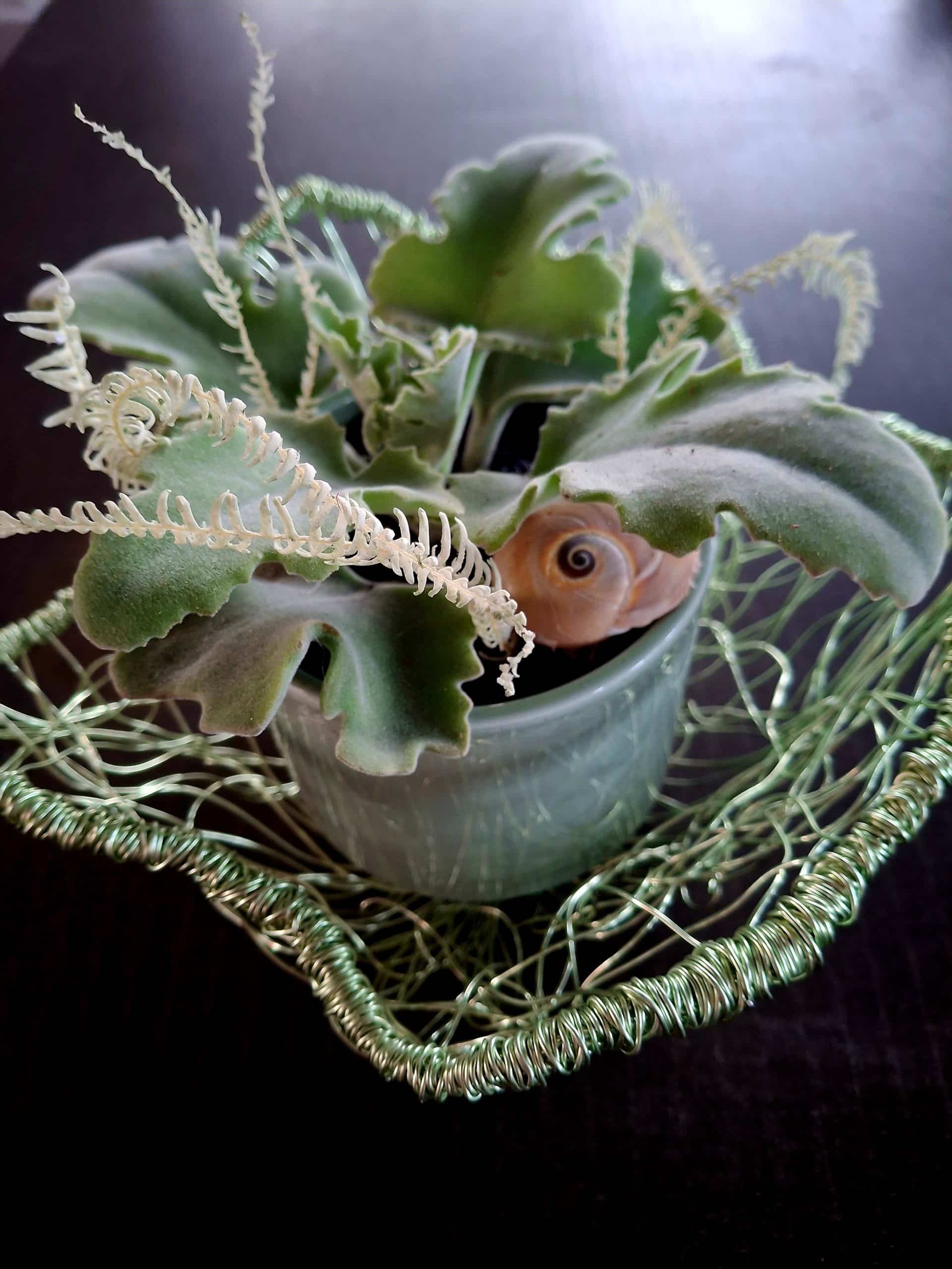 Handgemachte Kalanchoe in einem kunstvoll geformten, mintfarbenen Aludraht-Objekt. Ein modernes Stielecht-Unikat mit klarer Formensprache und edler Ausstrahlung.