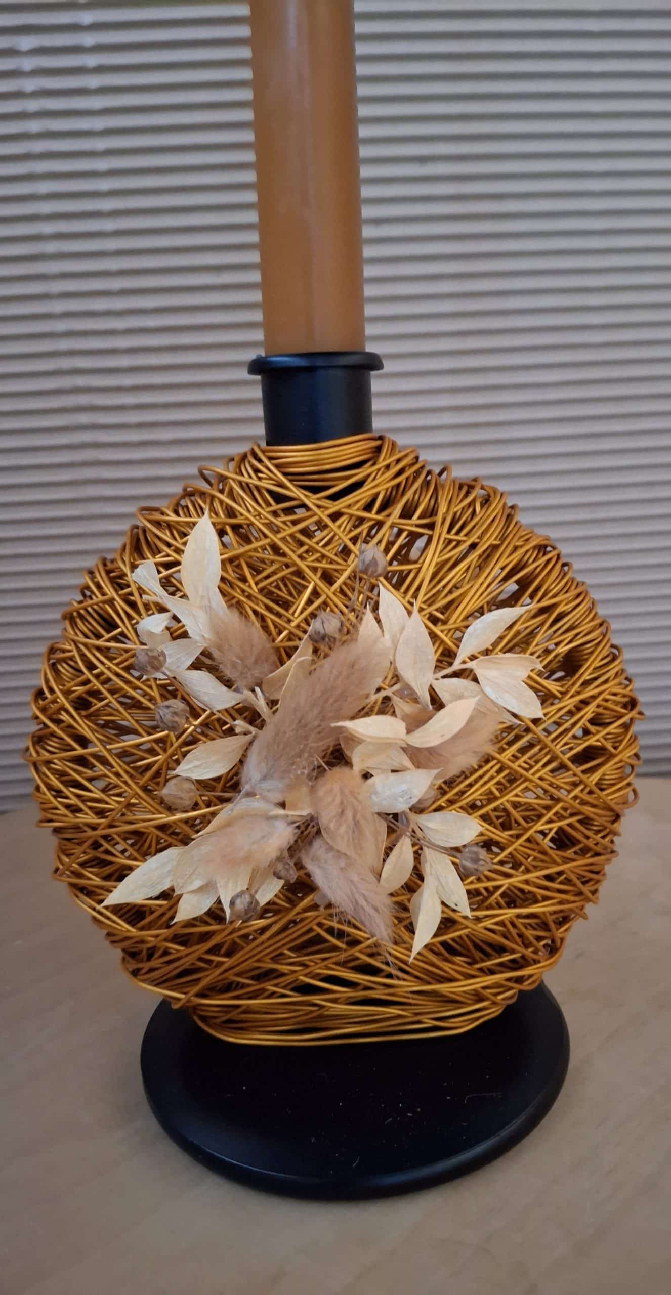 Ein stilvoller Kerzenständer mit orangefarbener Stabkerze. Der Aludraht in warmem Goldton ist kunstvoll verwoben und mit zarten Trockenblumen geschmückt. Eine moderne Herbst- oder Winterdeko, die jedem Raum einen besonderen Akzent verleiht.