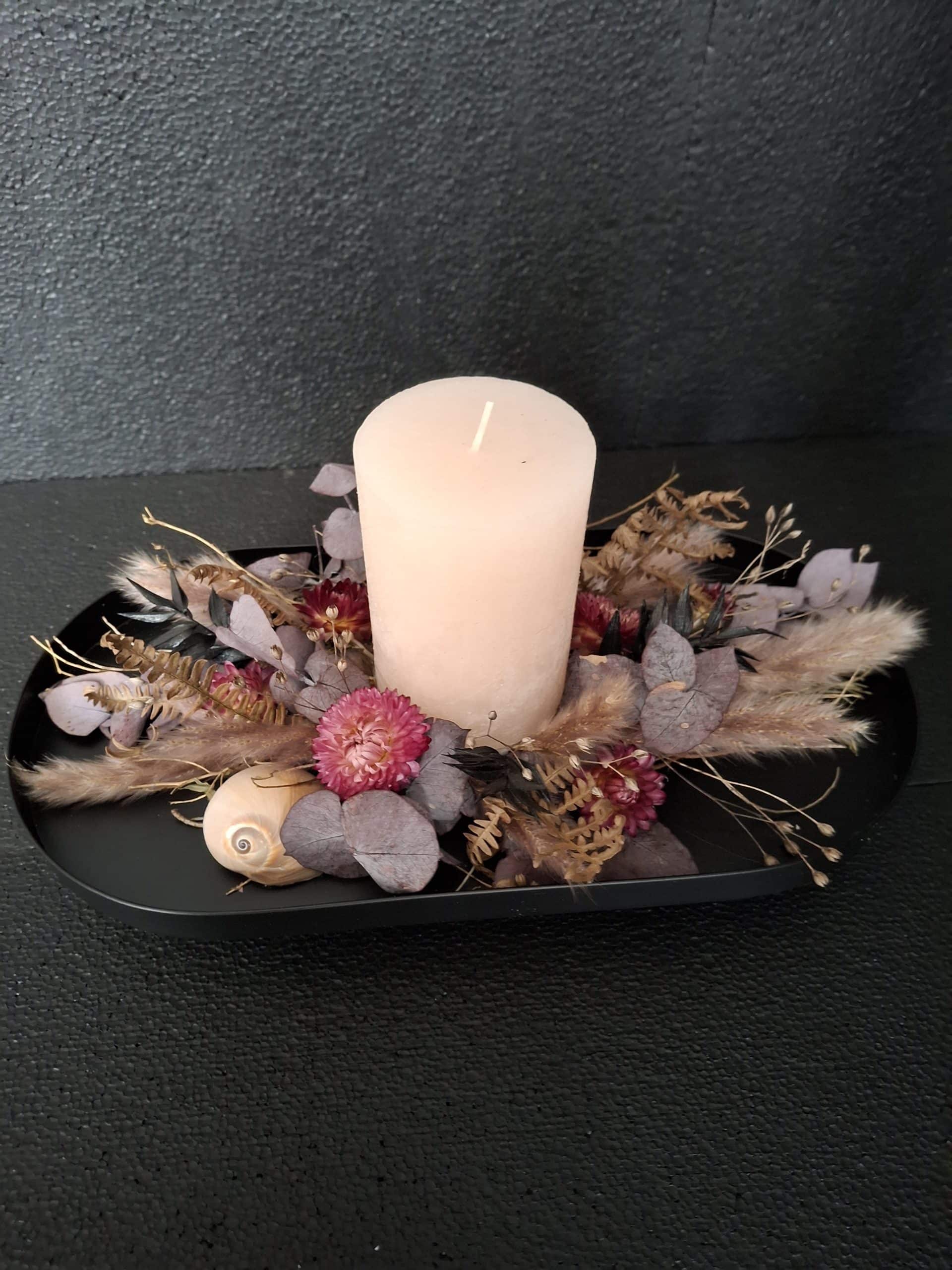 Trockenblumen-Arrangement mit Kerze in Bordeaux, Braun und Hellrosa in harmonischer Naturkomposition