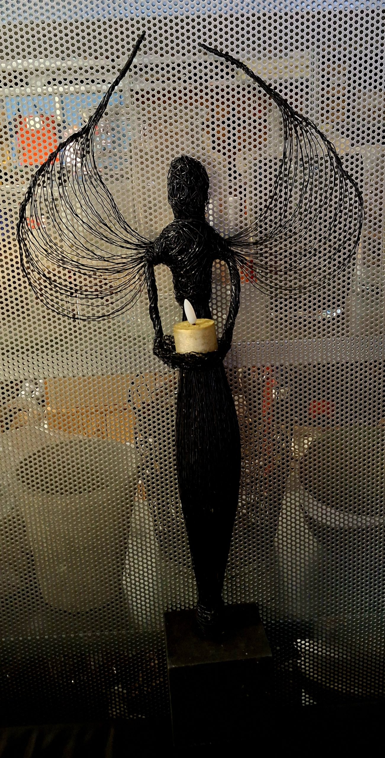 Schmaler, hoch aufragender Drahtengel in Schwarz auf Holzsockel, mit fein gearbeiteten Flügeln und batteriebetriebener Rechaudkerze. Ein stilvolles, modernes Adventsobjekt.