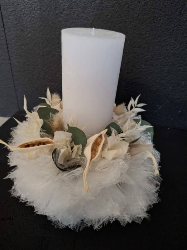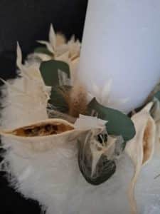 Die Sizoweb-Kerze mit Trockenmaterial ist eine edle, handgemachte Tischdekoration mit natürlichem Charakter und zeitloser Ausstrahlung.