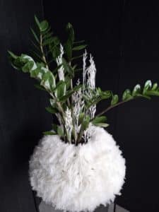 Dieses aussergewöhnliche Arrangement verbindet die klare, kräftige Form der Zamioculcas mit einer weichen, textilen Anmutung. Der Topf wird sorgfältig mit feinem Sizoweb umwickelt und anschliessend passgenau in eine Strohkranzform eingesetzt.